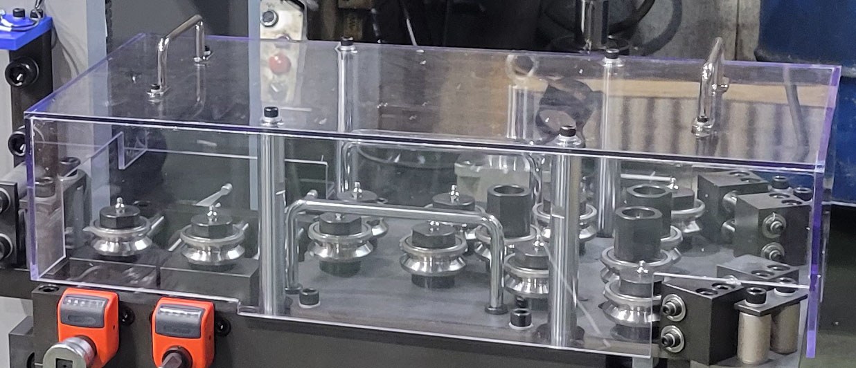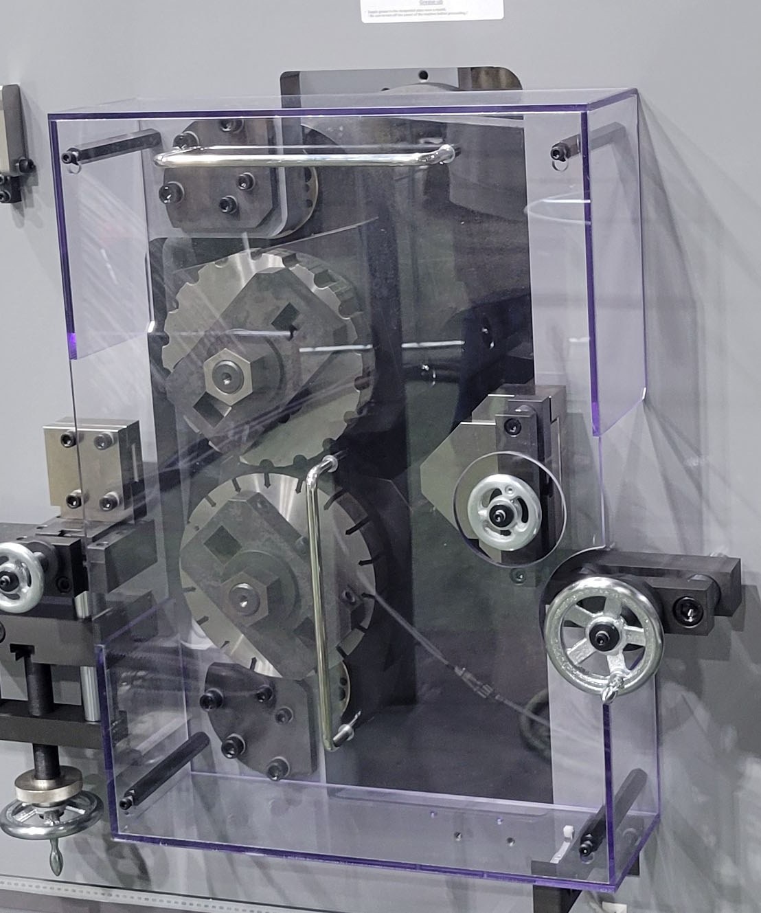 The covers for the main moving parts are made of transparent polycarbonate, allowing clear visibility of the internal mechanisms even when the covers are installed.